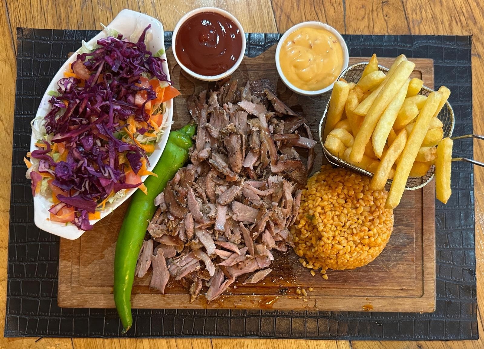 Viande de dinde et de veau grillée, salade, tomates, oignons et sauce